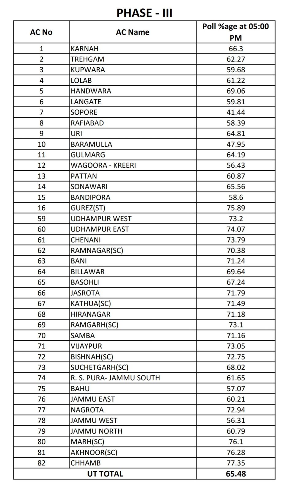 Election Commission of India said.However it said figures will continue to be updated AC wise on the Voter Turnout App by the ROs, as and when the polling parties formally close the poll and return from the polling stations based on the geographical/logistical conditions and after scrutiny of statutory papers and consideration of repolls, if any. In the phase-III, 40 Assembly Constituencies, spread across seven districts saw polling across 5060 Polling Stations set up for voters. 415 Candidates were in the fray including 387 men and 28 women candidates. The seven districts that went to polls include Bandipora, Baramulla, Jammu, Kathua, Kupwara,Samba and Udhampur.Phase-1 and Phase-2 saw a polling percentage of 61.38% and 57.31% respectively. Counting of votes is scheduled on October 8, 2024.The polling for the Jammu & Kashmir Legislative Assembly elections concluded in a peaceful and celebratory atmosphere, the poll body said. Scenes of voters patiently waiting in lines at polling stations, set against the scenic backdrop of the region, highlighted the people’s strong faith in democracy, it said.“The festive mood and enthusiastic participation were evident across all districts that went for polls in three-phased elections, underscoring a renewed spirit of civic participation and hope for a new era with people deciding their own future,” it said, adding, “CEC Rajiv Kumar along with ECs Shri Gyanesh Kumar and Dr. Sukhbir Singh Sandhu have delivered on their promise of ensuring democratic resurgence in Jammu & Kashmir.” CEC Rajiv Kumar said that “J&K Assembly elections have marked a significant deepening of democracy which will echo in the pages of history and continue to inspire a democratic spirit of the region for years to come.”He dedicated these elections to the people of J&K acknowledging their determination and belief in the democratic process, the poll body said. “The peaceful and participative elections are historic, wherein democracy is taking root more profoundly than ever before, driven by the will of people of J&K”.The elections were a resounding statement in favour of democracy in line with the CEC Rajiv Kumar’s vote of confidence given during the announcement of the General Elections in J&K on August 16, it said.“He had then expressed that in Jammu-Kashmir, the world will witness the defeat of nefarious and inimical interests and the triumph of democracy”. Voting across 40 ACs in the third and final phase which commenced at 7 AM today was held peacefully without any incidents of violence. As of 7 PM, a voter turnout of 65.58% was recorded at the polling stations.Despite an increase in the number of assembly constituencies from 83 in 2014 to 90 in 2024, the elections were completed in 3 phases this time as against 5 phases in 2014. No major law and order incidents related to the election were reported, a significant improvement from 2014 when over 170 incidents were reported, including 87 on polling days, the poll body said.“From the very beginning, clear instructions were given for ensuring a level playing field including no bias in allotting permissions for campaigning, which has resulted in vibrant campaigning across the political spectrum in J&K.” There have been no complaints pertaining to arbitrary preventive detention of political functionaries in these elections which is unprecedented, it said. “The Commission had also strictly instructed against clubbing of Polling Stations just before the poll day, and accordingly, voters voted at their actual polling station location as opposed to 98 polling stations shifted in 2014 at the eleventh hour.” Role of money and muscle power has been curtailed to a significant extent, it said. “Vigilance and seizures have been fortified by the coordinated efforts of Enforcement agencies resulting in seizures worth 130 crores, highest ever in the history of J&K elections and even surpassing Rs 100.94 crores done during Lok Sabha Elections 2024.” The bulk of seizures included drugs worth Rs 110.45 crore, it said. “12 ACs were identified as Expenditure sensitive for enhanced vigil. Strong security measures were in place creating a conducive environment for voters to cast their vote without fear or intimidation,” it said, adding, “Across 90ACs, webcasting was in place in 100% polling stations to ensure transparency of the voting process as compared to 20% polling stations in 2014 assembly elections. Increasing vibrancy of electorate Intensive efforts to increase the size of the electorate have yielded results.” Overall, it said, there has been a significant increase (23%) in the size of the electorate from 2014. Encouragingly, the gender diversification of the electorate is very apparent with an increase of 27.90% in female electors. Young electorate, especially first time voters, embodied the aspirations of peace, democracy and progress and proudly showcased their inked fingers after voting. (GNS)