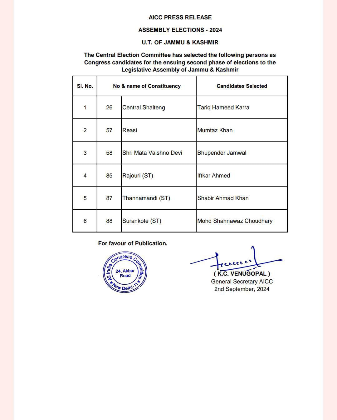 Srinagar: Jammu and Kashmir Pradesh Congress Commitee (JKPCC) has announced six more candidates for the assembly segments, going to polls in the second phase of elections in Jammu and Kashmir.The list figures the JKPCC Chief, Tariq Hameed Karra, who has been given a mandate from Central-Shalteng seat.