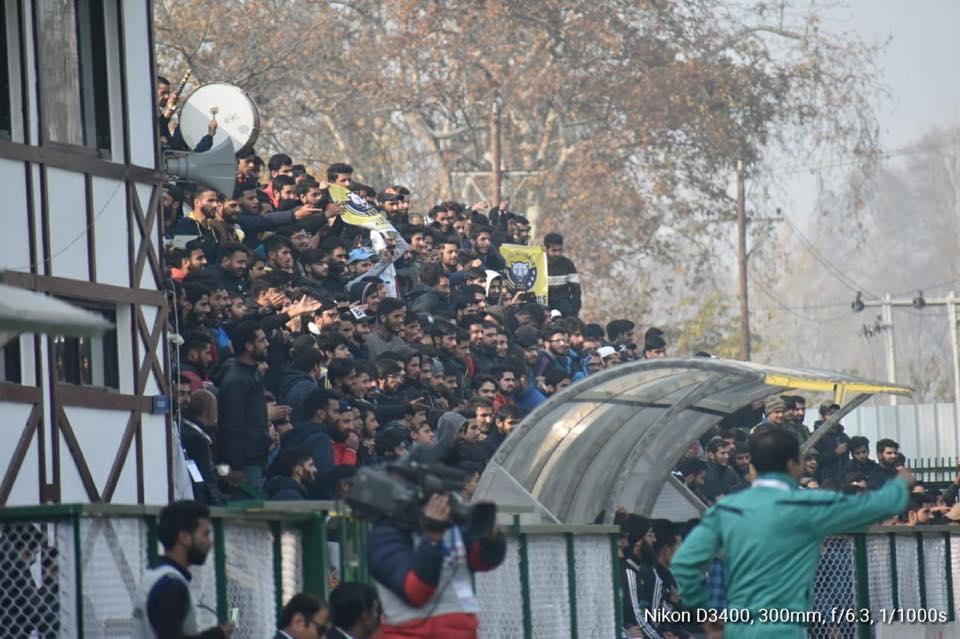 Supporters of Real Kashmir watch a match during the I-League encounter at TRC Turf Ground in Srinagar, on Tuesday.