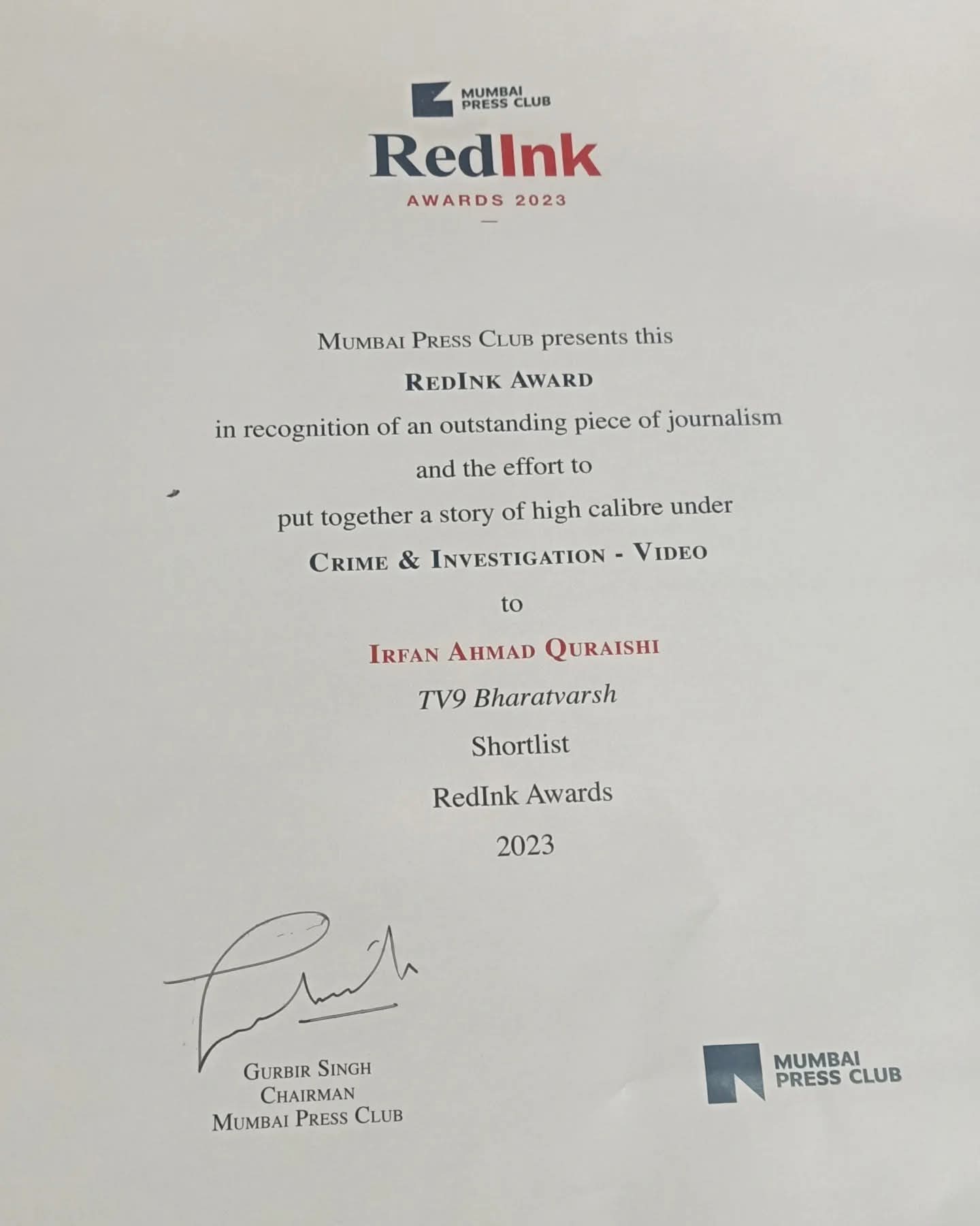 Irfan Quraishi’s excellence in journalism has been celebrated with prestigious accolades. In 2023, he received the coveted RedInk Award from the Mumbai Press Club in the Crime & Investigation (TV) category, recognizing an outstanding piece of journalism.