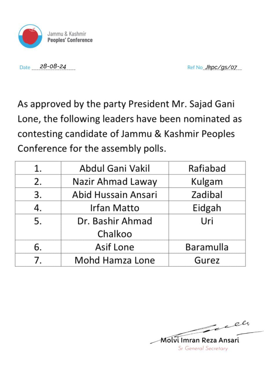 Representational pic Share FacebookWhatsAppTwitterGoogle+EmailFacebook MessengerTelegram WhatsApp Group Join Now Srinagar: JK People’s Conference led by Sajad Lone announce first list of candidates for the Assembly Elections. WhatsApp Channel Join Now Announced First list of candidatesAssembly ElectionJKPC Share FacebookWhatsAppTwitterGoogle+EmailFacebook MessengerTelegram