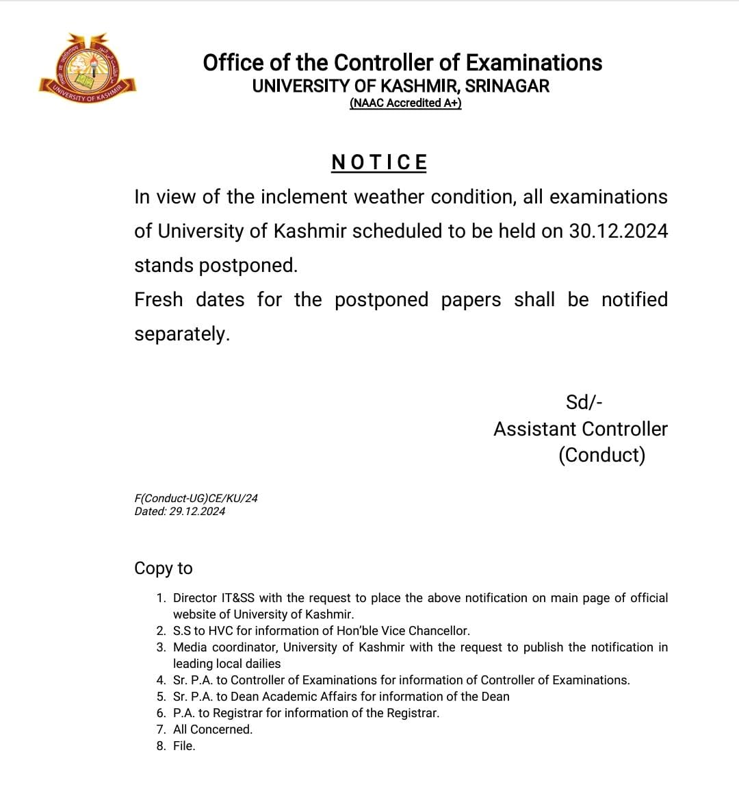 According to the KU official in a statement said, “In view of the inclement weather, all examinations of the University of Kashmir, scheduled to be held on December-30 are postponed.”
