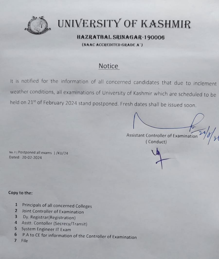 “It is notified for the information of all concerned candidates that due to inclement weather conditions, all examinations of University of Kashmir which are scheduled to be held on 21 of February 2024 stand postponed”, reads a notification .