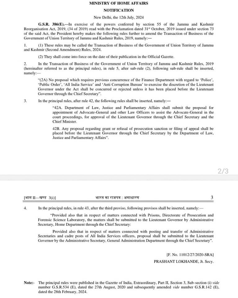 According to amendments made by the MHA, the proposals relating to transfer of administrative secretaries and cadre posts of All India Service (AIS) officers shall be submitted to the Lieutenant Governor of J&K by the administrative secretary, General Administration Department through the Chief Secretary.