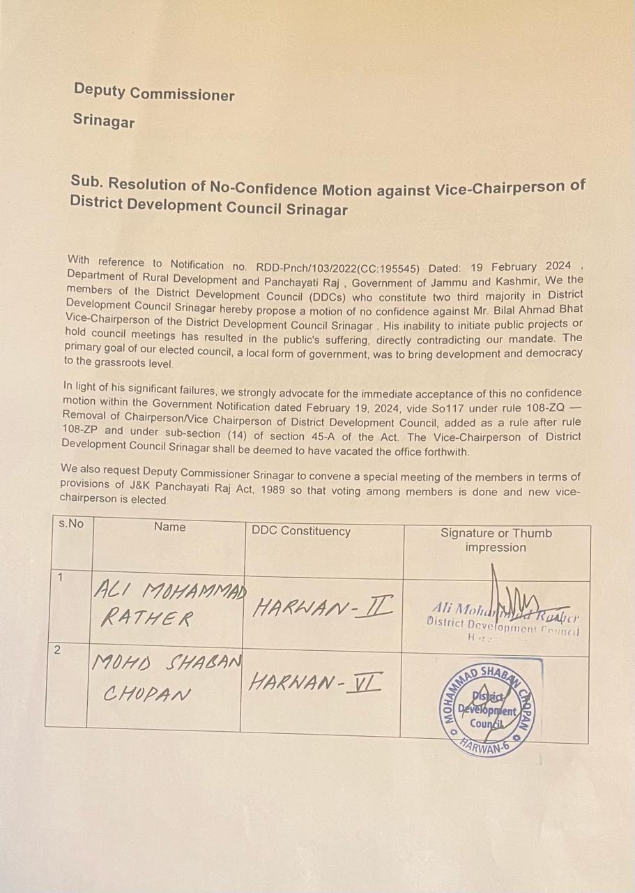 Srinagar: In a significant development, members of the district development council (DDC) Srinagar have moved a no-confidence motion against the incumbent chairperson of the council.