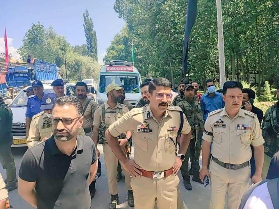 SSP Baramulla Rayees Mohammad Bhat accompanied by other middle and lower-rung officials have been escorting mourners since this morning and were seen distributing water and other essentials alongside volunteers among the mourners.(GNS)
