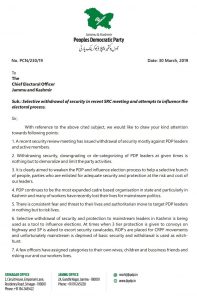 @jkpdp writes to the Chief Electoral officer with reference to security withdrawal of leaders. "selective approach to basic security considerations amounts to fixing the election results through tactical rigging as our leaders and workers are being denied level playing field". pic.twitter.com/HautENLflG