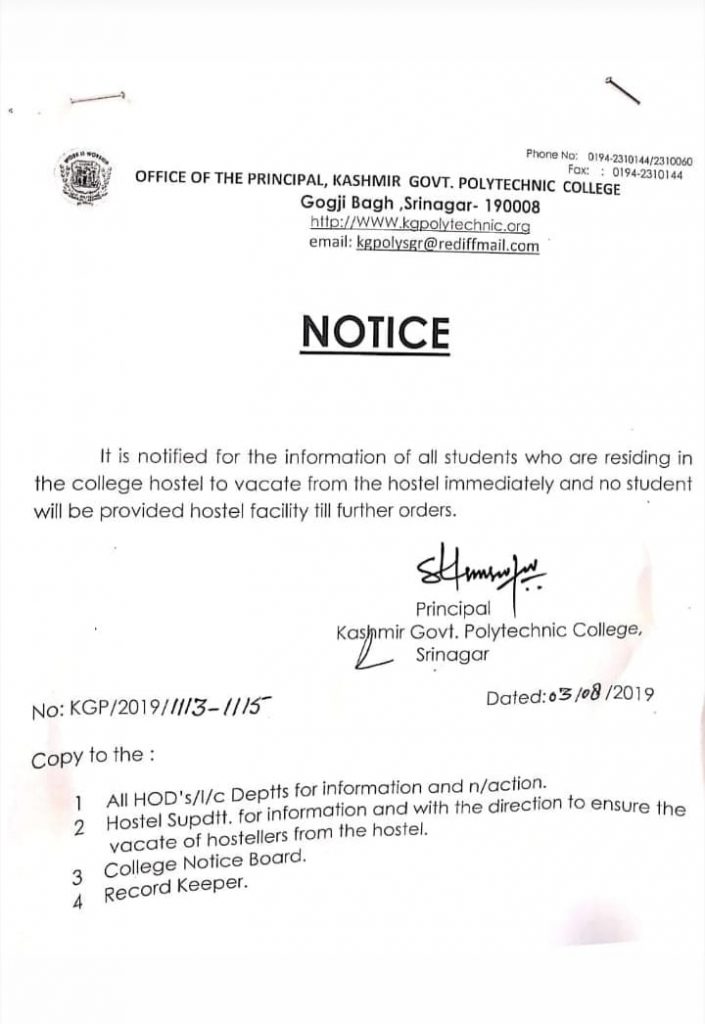 Srinagar, In yet another order that is making rounds on social media networking sites, Principal Kashmir Government Polytechic College Srinagar have asked students to vacate the college hostel immediately.