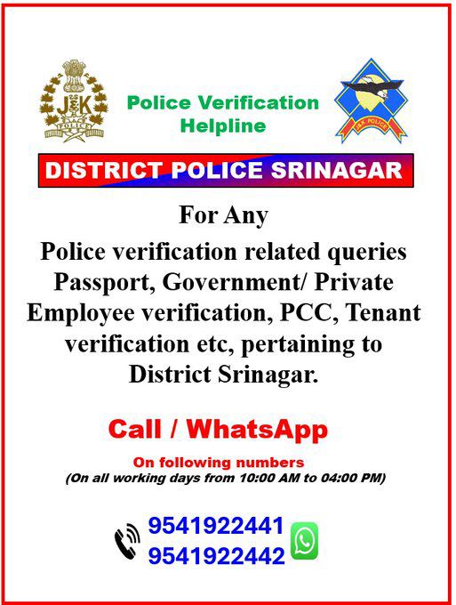 The initiative aims to simplify the process for citizens and ensure timely responses.The helpline will cater to grievances and queries regarding: Passport Verification,Police Clearance Certificates (PCC), verification for Government and private employees, besides tenant verification.Police said citizens can reach out to the helpline for assistance through calls or WhatsApp messages. The contact numbers are: 9541922441 and 9541922442.”Working Days: Monday to Friday, Timings: 10:00 AM to 4:00 PM,” police said.This initiative reflects the commitment of Srinagar Police to ensure transparency and enhance public convenience. Citizens are encouraged to use this facility for hassle-free resolution of their verification-related issues. (News Vibes of India)
