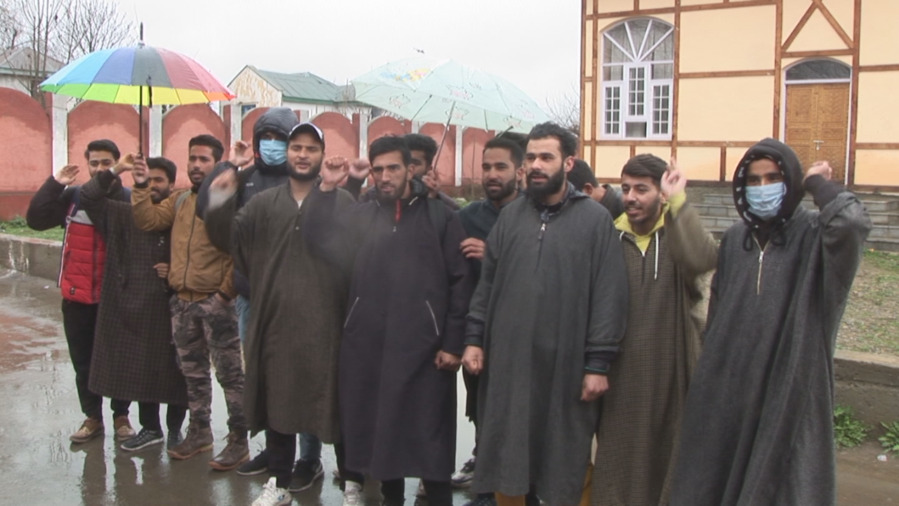 Students of GDC Sumbal stage against University authorities for their decision to hold fresh examinations of a paper.