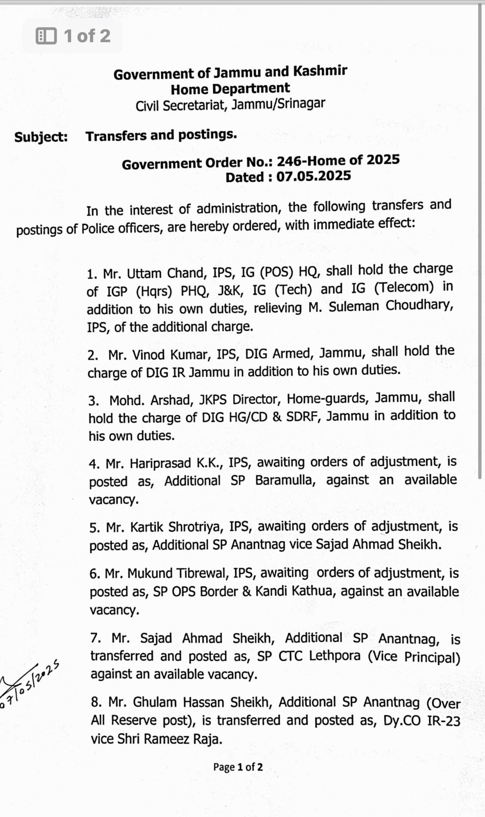 - Mohd. Arshad, JKPS Director, Home-guards, Jammu, shall hold the charge of DIG HG/CD & SDRF, Jammu in addition to his own duties.